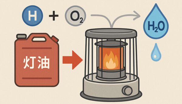 石油ストーブで灯油を燃やすと、灯油を構成する「水素」が空気中の「酸素」と結びつきます。